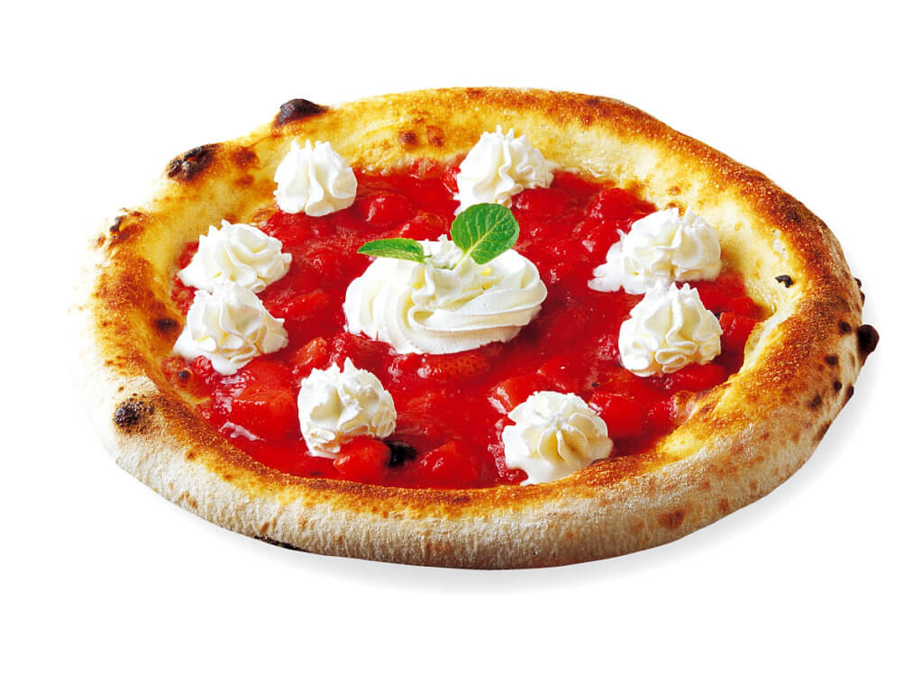 特製いちごソースで焼き上げたピザに、ホイップクリームと特製いちごソースをかけていただくドルチェピッツァ。