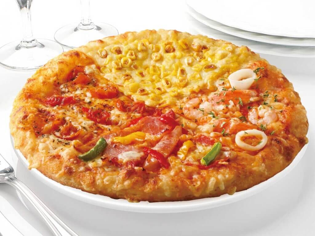 当時からのロングセラーメニュー4種類を1枚で楽しめます。 【1】シーフードスペシャル 【2】アメリカンミート 【3】クワトロチーズのマルゲリータ 【4】たっぷりコーンピザ