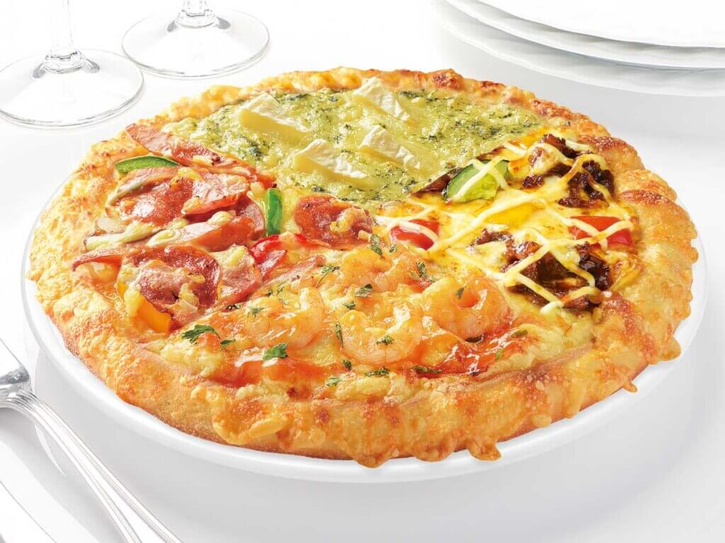 1枚で日・米・伊・中の4つの味をクルージングできます。 【1】ピザ・牛カルビ 【2】ピザエビチリ 【3】アメリカンミート 【4】カマンバジル