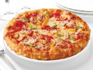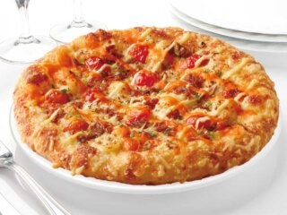 プリッと食感の粗挽きソーセージに、ジューシーなベーコンやペパロニをトッピング。ボリューム満点ピザ!